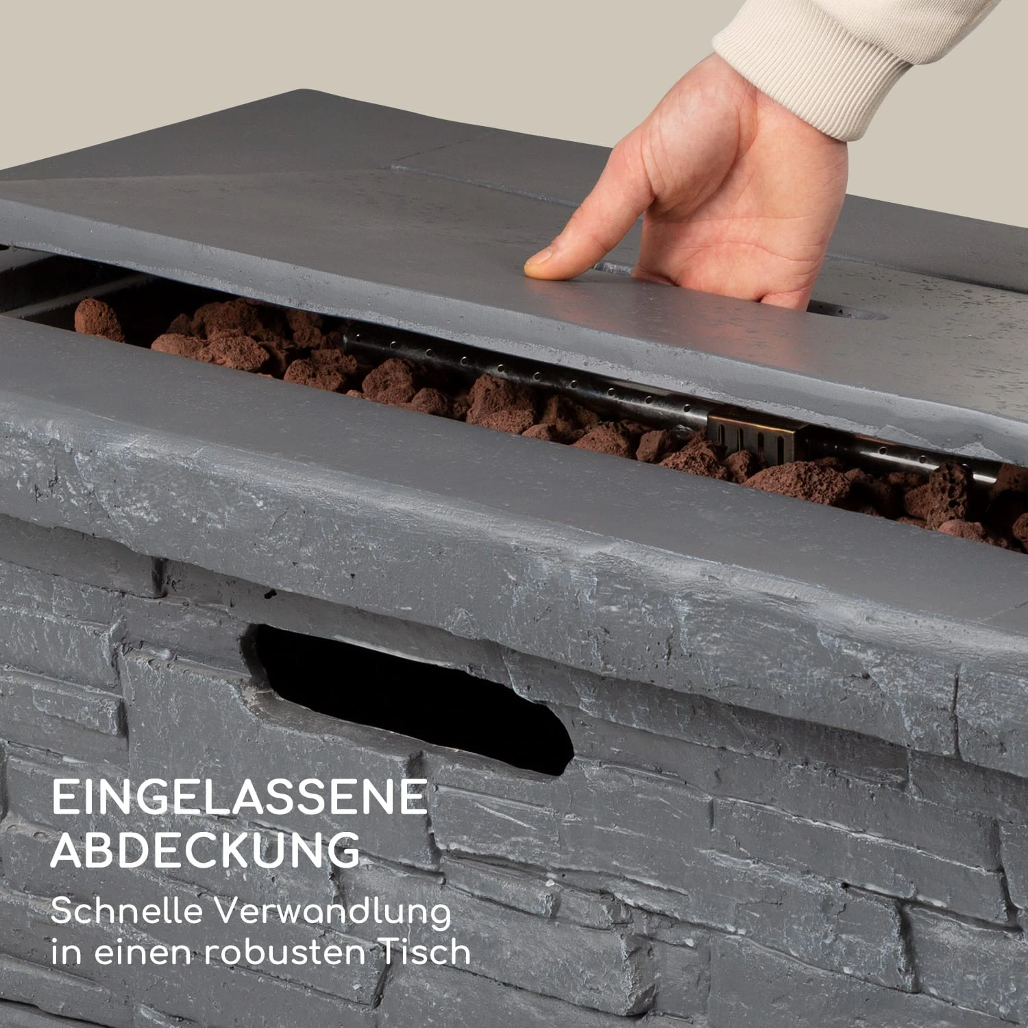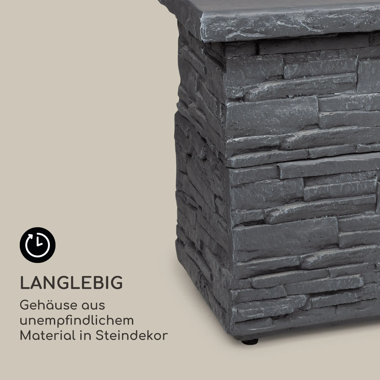 Mit der dekorativen blumfeldt Anafi Gas-Feuerstelle kannst du in deinem Garten ein wundervoll romantisches Feuer entfachen und zeitgleich einen praktischen Gartentisch installieren. Dabei besticht das rustikale Design im Steindekor und durch die perfekt eingelassene Abdeckung der eigentlichen Feuerstelle ist der exklusive Terrassenheizer wandelbar: mit nur einem Handgriff entsteht eine große Tisch- oder Ablagefläche. Nimmst du den exakt passenden Deckel ab, dann zeigt sich eine Feuerstelle, in welcher wärmende Flammen aus natürlichen Lavasteinen züngeln.