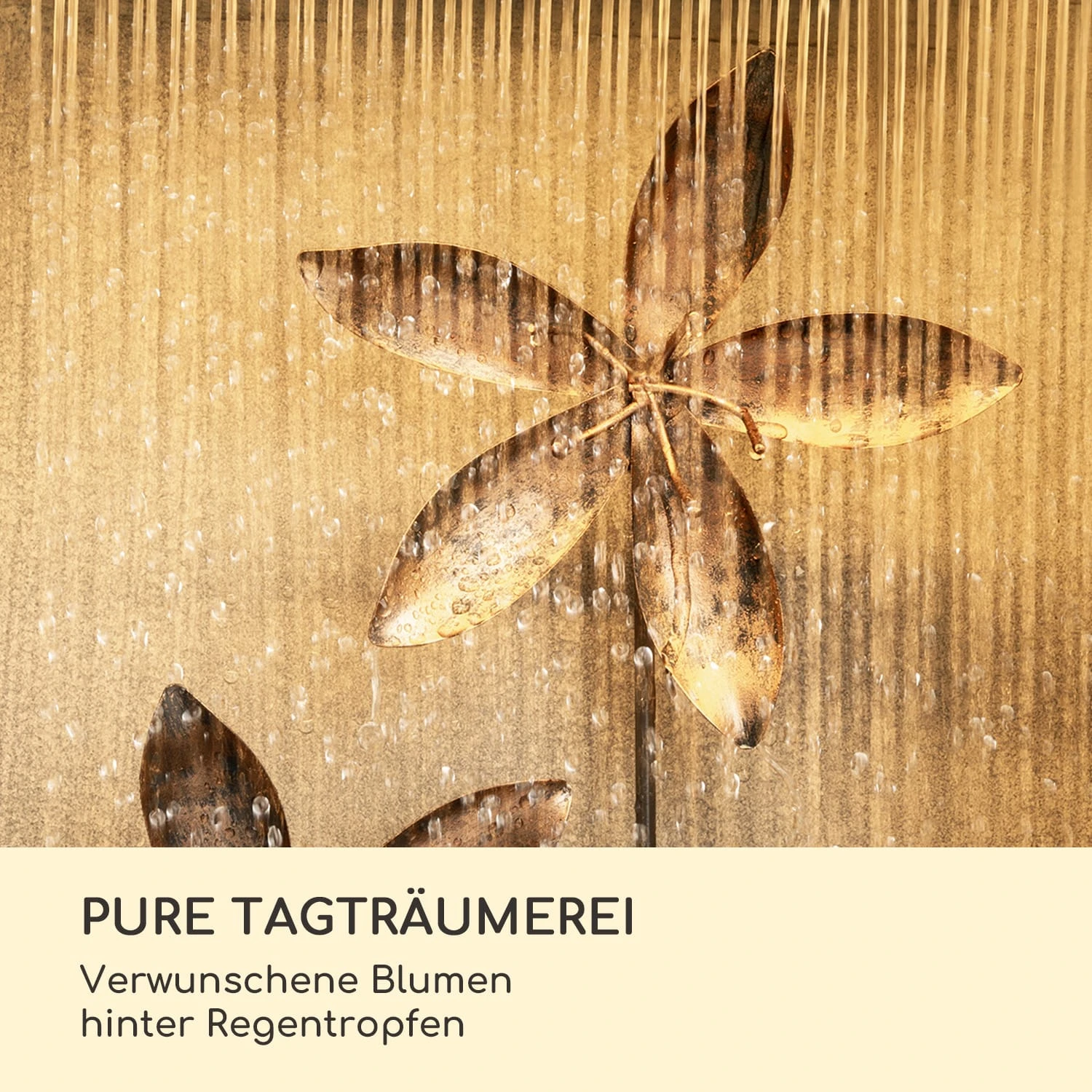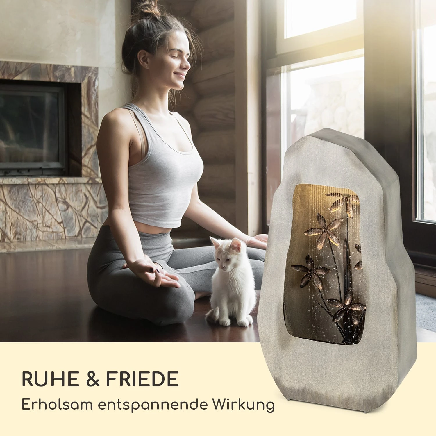 Fast wie Höhlenzauberei: Fünf goldfarbene Blüten die sich dezent aus ihrem Versteck zeigen und von feinen Regenperlen benässt werden. Dieser Anblick ist fazinierend und lädt zum ständigen Bewundern ein. Besonders zauberhaft wirkt dabei die dunkelgelbe Beleuchtung, welche das künstlerische Wasserspiel in eine warme Atmosphäre taucht. Zaghaft verspielt zeigen sich die Blüten mit ihren Blättern hinter der Regenkaskade und schimmern wie Bronze mit schwarzen Schattierungen: Der blumfeldt Garden Fountain Athena Zierbrunnen verführt dich zu Tagträumen und schenkt dir erholsame Entspannung. Stundenlang kannst du dem feinen Plätschern lauschen, denn der Zimmerbrunnen arbeitet mit einem konstanten Wasserkreislauf. Dank der starken Pumpe wird immer wieder das gleiche Wasser umgewälzt. Das ist nicht nur besonders nachhaltig, es sorgt auch dafür, dass der Brunnen frei steht. Er benötigt keinen direkten Wasseranschluss.
