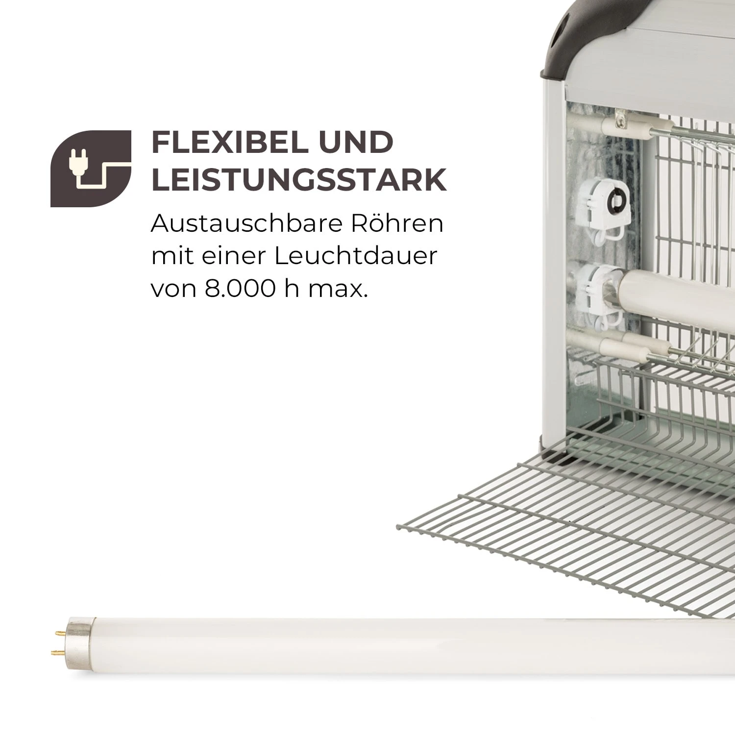 Mit dem Waldbeck Mosquito Ex 4000 Insektenvernichter halten Sie sich rund um die Uhr schwirrende Futterneider und stechfreudige Blutsauger vom Leib. Das 30 Watt starke Gerät lockt Ungeziefer durch seine unwiderstehliche geräusch- und geruchlose Ausstrahlung herbei: 2 x 10 Watt leistungsstarke Röhren geben ultraviolettes Licht an ihre Umgebung ab und ziehen dadurch Insekten in der unmittelbaren Umgebung an. Ein hochwertiges Drahtgitter im Inneren der Insektenfalle versetzt den Angelockten einen 2500 V starken tödlichen Stromschlag und macht somit den Einsatz toxischer Chemikalien und Substanzen überflüssig. Durch einen Wirkungsbereich von 100 m² ist der praktische Helfer bestens für verschiedenste Innenbereiche wie Wohnungen, Küchen oder auch Ställe geeignet. Sämtliche getöteten Insekten fallen in eine abnehmbare Auffangschale, die einfach aus dem Gerät herausgelöst und gereinigt werden kann. Auch die Schutzgitter, die von Außen den Kontakt zu den Stromdrähten verdindern, können bequem abgenommen und gewaschen werden. Zur sicheren Platzierung der Falle außerhalb der Reichweite von Kindern und Haustieren dient zudem eine praktische Aufhängevorrichtung, die mit Hilfe einer mitgelieferten Kette in der gewünschten Höhe angebracht werden kann.
