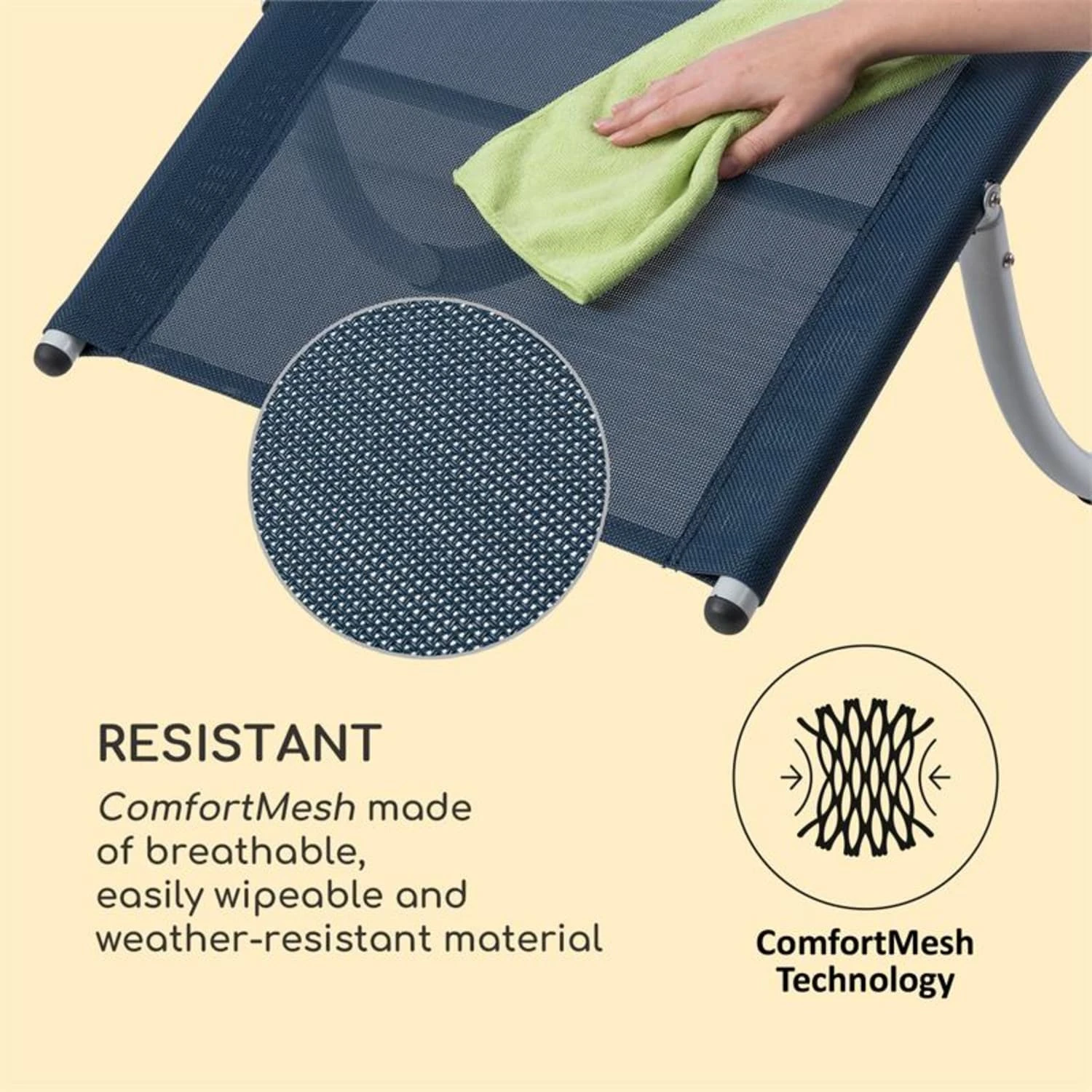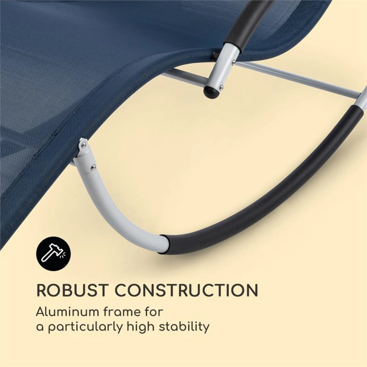 Der robuste Rahmen aus Aluminium der Blumfeldt Westwood Rocking Chair Schaukelliege verleiht dem Liegestuhl eine besonders hohe Stabilität. Sanft und kontrolliert wiegt er sich auf seinen gummigeschützten Kufen hin und her. Die bequeme Liegefläche aus comfortMesh lädt dank Ergo Comfort-Bauweise zum ausgiebigen Relaxen ein, während Gummiüberzüge den Rahmen zu einer angenehmen Armablage verwandeln. Dank Ergo Relax-Funktion erhöht das abnehmbare und verstellbare Kopfkissen zusätzlich den Liegekomfort. Für lange Freude am Gartenmöbel sorgt die wasserabweisende Pulverbeschichtung des Rahmes sowie das atmungsaktive, witterungsbeständige, leicht abwischbare Material der Liegefläche.